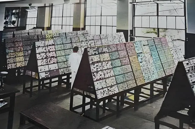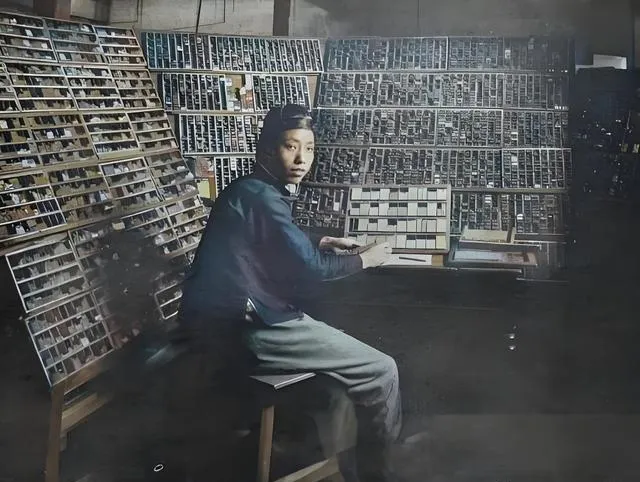 图中这一屋子叫排字房,木排架一面面立着,铅字像小石块,一格一格卡得紧,年轻的排字员腰板不敢太弯,手指在格子间拣拣点点,一页报纸得走上好几里字架路,妈说你看这手势,像弹琴,其实是跟时间赛跑。
