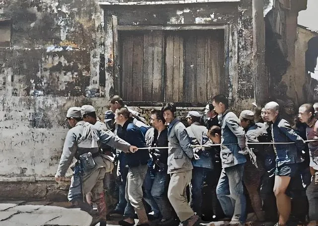 这个场景叫押解,几个人被粗绳串一串,绳子勒在腋下,队伍被硬生生拽着往前走,墙皮脱落的旧巷子像一条没有出口的沟,最前头的枪刺斜着指路,没人说话,脚步声和绳子摩擦的声音更让人心里发紧。