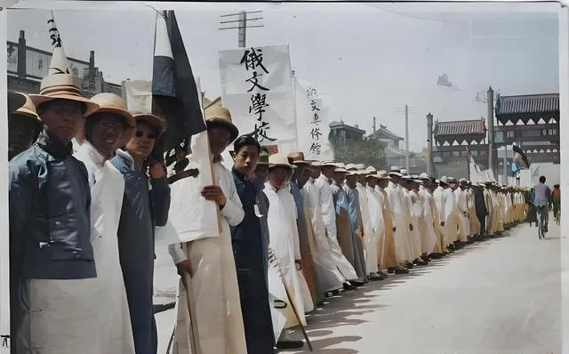 这些穿长衫的年轻人,手里举的是院系旗,帽沿把脸遮出半截阴影,身形却站得齐齐整整,队尾的人踮脚张望,像在问前面到了没,老师说别扯嗓子,走齐了队形就是最响的口号,以前我们也上过街,现在更多是在屏幕上表达心意,差别在脚步上,心意却不能打折。