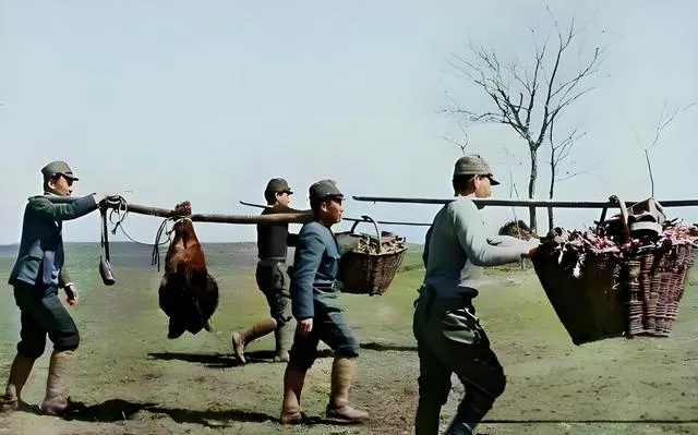 这几个人肩上的担子沉,粮食塞满筐,旁边还吊着黑猪,脚步迈得飞快,像怕谁追上来,地面的泥痕被挑杖压出一溜深浅不一的点,画外的人看着心口堵得慌,东西都能称斤,眼泪却没分量,以前村里人说过一句,走得再快,也跑不过报应。