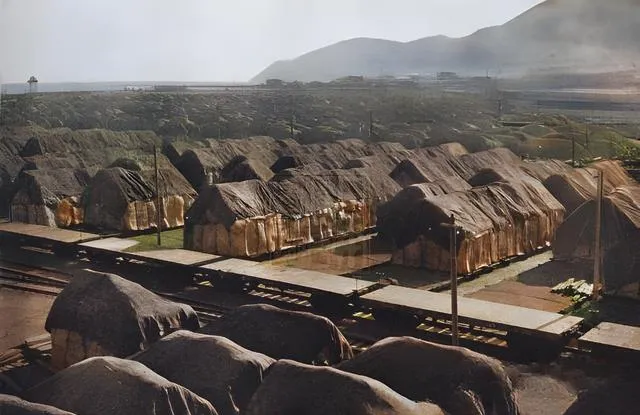这一排排草帘子底下全是收来的粮食,黄到发亮的麻袋背着海风起伏,铁轨把场子分成井字,远处小山像啃掉一角的馒头,静默得让人心里发酸。
