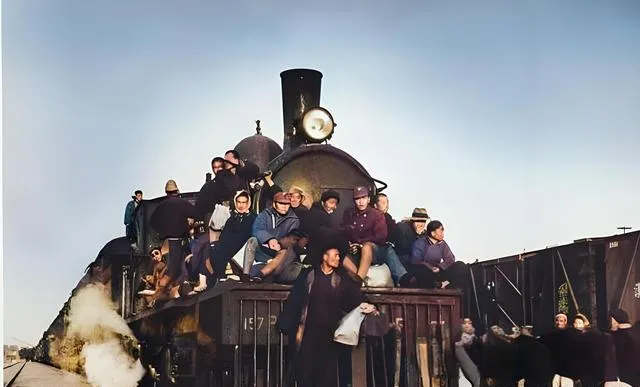 这个场面叫挤命车,黑烟从烟囱里顶出来,车头两侧的人攥着铁栏杆,帽檐被风掀起一道弧,小时候听爷爷学那声汽笛,呜一下,本能就想往家跑。