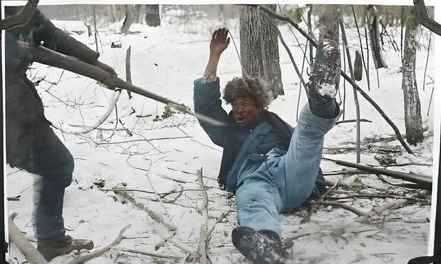 这张最揪心,雪面碎得像玻璃渣,棉袄上全是冰壳,战士一条腿蹬在半空,另一条被树根绊住,他的眼神不让人看第二次,硬,就是这个字。