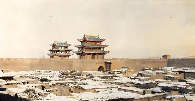 图中这道关城就是嘉峪关,近处一片平顶屋连成瓦片海,土坯墙被雪压得沉沉的,城墙线条笔直,门洞像一只眯着眼的兽,城楼三层檐角挑起,颜色在老照片里也能看出层次,灰里透着红,红里压着青。