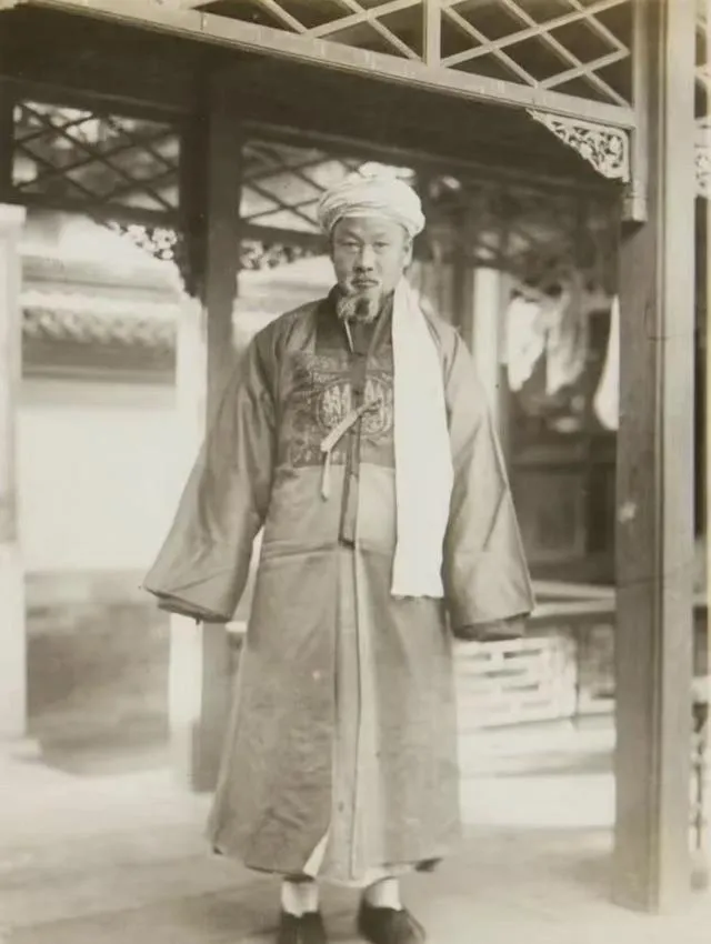 这个穿蓝色长袍的叫阿訇,头上白色回回帽,围着长长的巾,袍子上半截绣花密密,线脚像绕在云上,脚下黑布鞋配白袜套,一看就是讲规矩的装束。