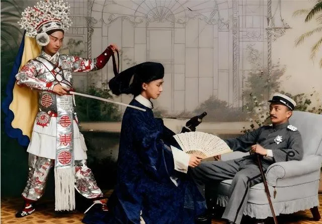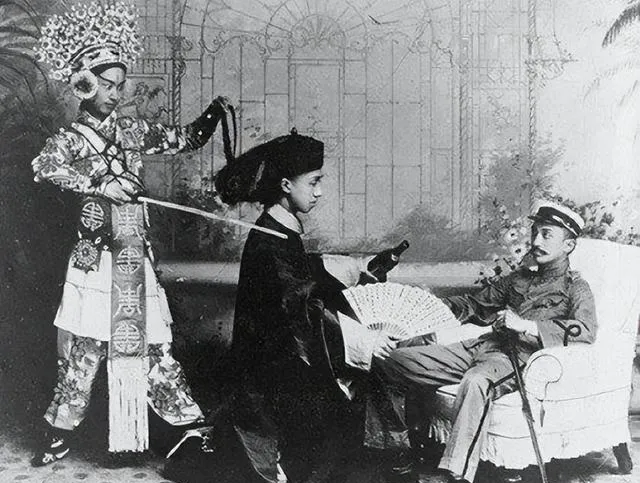 这张照片里,戏服人物站在后头,手里那根“挑”的动作做得夸张,中间的人拿着折扇,右边坐着的靠椅一斜,整张图像舞台一角,表情不对劲,笑不真,眼神虚,看一眼就知道“请”来的不是客,是道具。