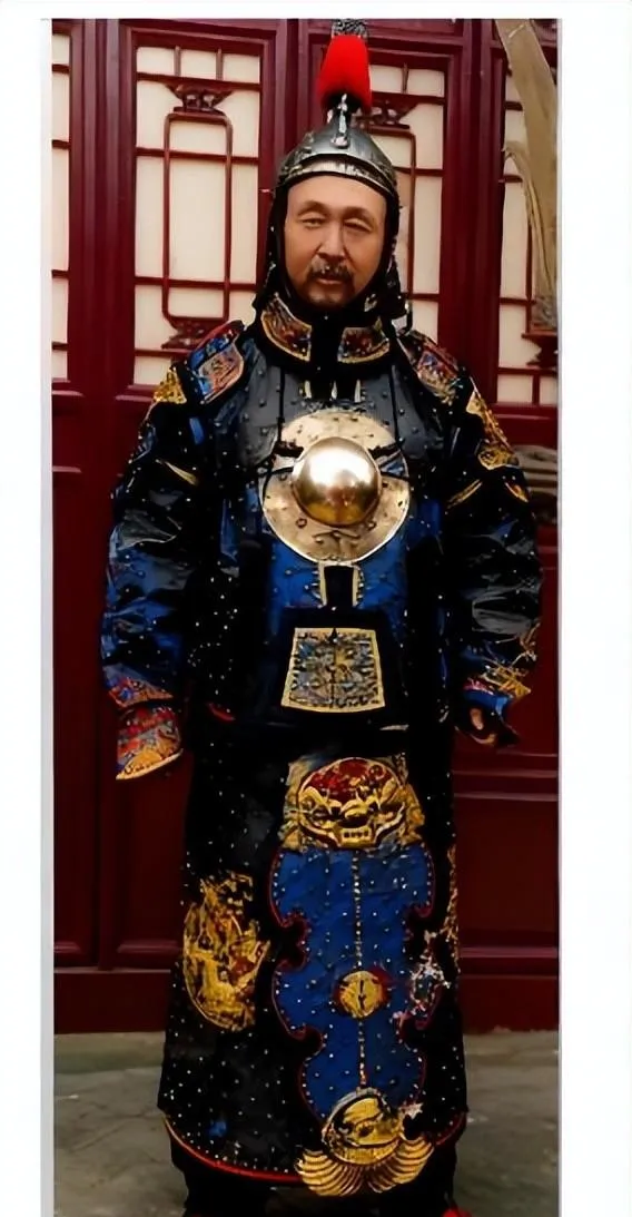 这个威严的甲胄属于左宝贵,胸前一枚大圆护心镜,亮得像把日光扣在上面,通体黑与蓝对着来,边角是金黄纹样,盔顶一撮红缨立得直,细看铆钉一颗颗,像星子撒在铁夜里。