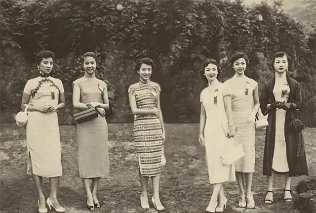 这组合影里穿的是及踝旗袍,立领、盘扣、开衩都利落,最右边那位搭了件薄外褂,层次一下就起来了,发型是蓬松卷,胸针别在衣襟,细跟鞋跟草地不太合,走路得拿捏分寸,外婆指着照片说,旗袍最讲究贴身但不勒身,要让人看见线条又留点余地,那个尺度,靠的是师傅一寸寸放出来的。