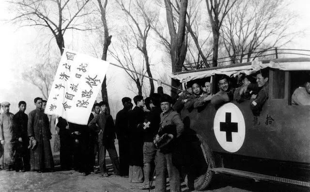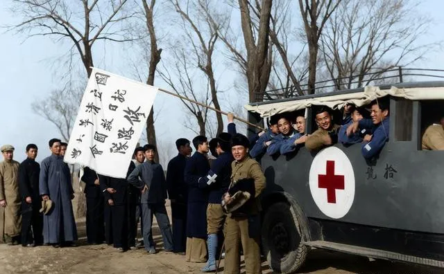 这面白旗上写着清华大学抗日救国会修路,学生们挤在带红十字的车旁,或站或笑,袖口还带着补丁,路要通,物资才能上去,爸爸说,书可以晚读,路不能断,现在修路有钢甲车队和无人机,那时候靠一把铁锹一根撬杠,车篷里探着头的青年,眼神里全是要紧的劲儿。