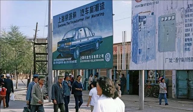 你是不是也有这种感觉啊,翻到八十年代末的彩色老照片,一下就被那股新旧交错的味儿拽回去了,街头巷尾还是熟悉的土路和招牌,可一块蓝底大牌子上画着**“上海桑塔纳,汽车新潮流”**,那会儿听着就新鲜,价钱也吓人,二十多万摆在那儿,家里人算了半天账也只敢议论两句,谁家真要是开回来一辆,邻居都得来围着看热闹。