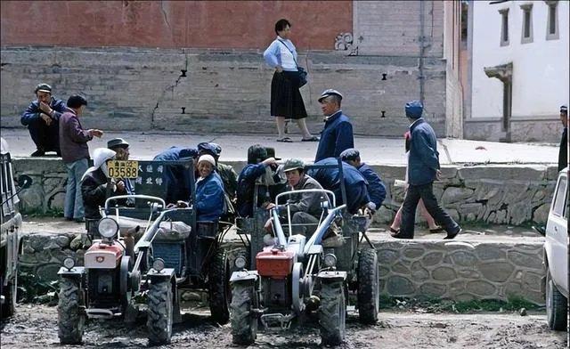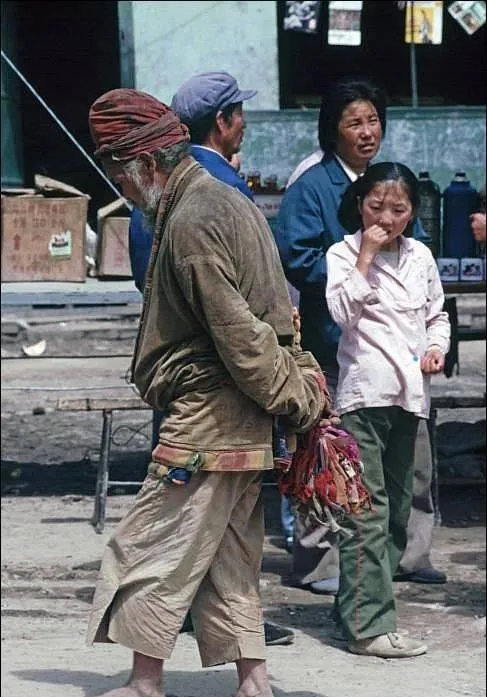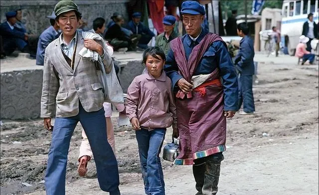 这个组合就叫西装与中山装,左边格子西装敞着怀,右边绸腰带紧紧一束,中间的小姑娘跟着两步一回头,男人们脸上都有风吹日晒的颜色,腰里提一把铝壶,像刚从远处赶集回来,爸爸说改革开放以后,赚钱快的穿得体面点,也有人惯着旧打扮,谁也不笑话谁,街面上就这么和和气气走着。