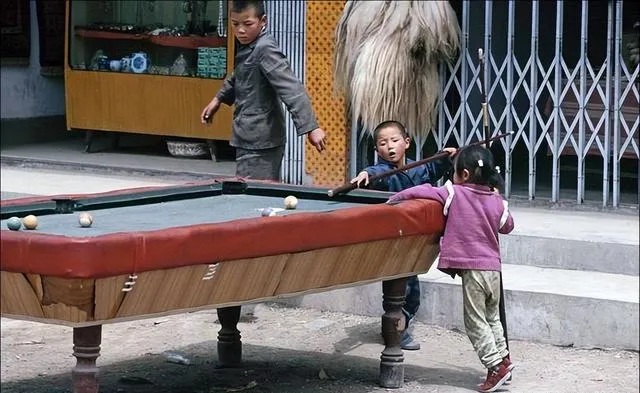 这个小桌子叫桌球台,革面磨得发亮,四角包着金属角,几颗球滚来滚去叮一声好清脆,小子们扒着台沿,球杆比人高出一截,瞄准半天一杆戳空,笑得前仰后合,小时候我也是在这种小台子边儿上混日头的,口袋里揣两毛钱,老板撕一截小纸条算时长,赢一局能吹一整天。