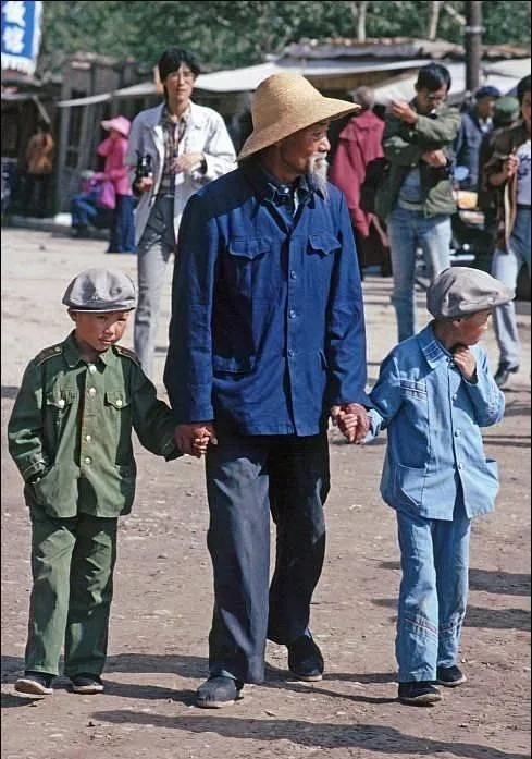 图中这位老人的穿着叫蓝布工作服,头上草帽一压,牵着两个小孙子,一边一个,左边小孩穿着绿军装式夹克,右边是淡蓝牛仔,爷爷脚步稳稳的,胡子花白,奶奶在旁边小声说别跑丢啦,那个年份刚开始讲计划生育,一家就指着这一个或两个宝贝,逢年过节拍照都要站中间才算出息。