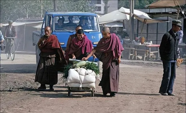 这个镜头叫喇嘛买菜,三位身披深红袍子,手推木架车,车上铺着白麻袋和青菜,前面一辆蓝色小卡车慢慢挪动,尘土在阳光里飘着细光,师父笑着还价两句,摊主把秤砣往上一挪,妈妈说青海这边尊重僧人,买菜也要排队讲规矩,现在手机一扫就付钱了,当年全靠秤和嘴皮子。