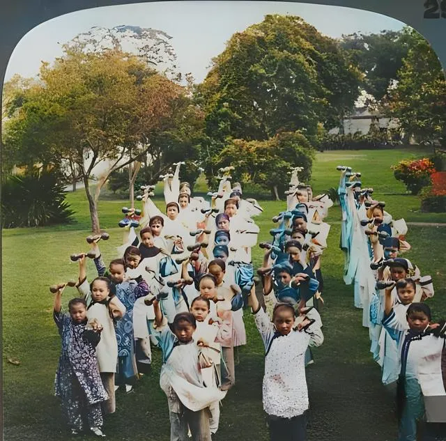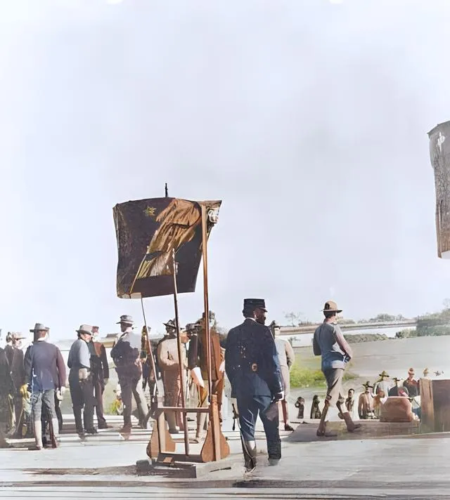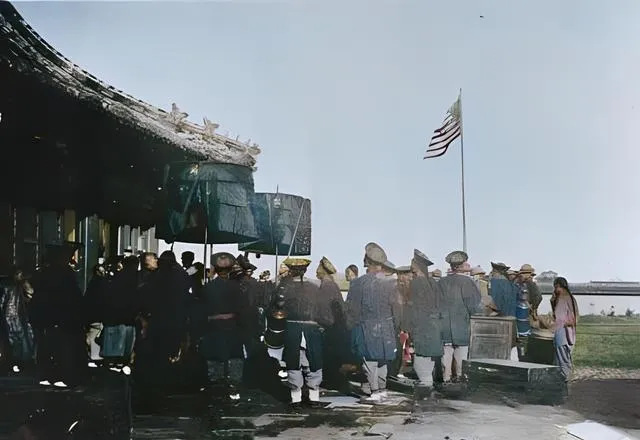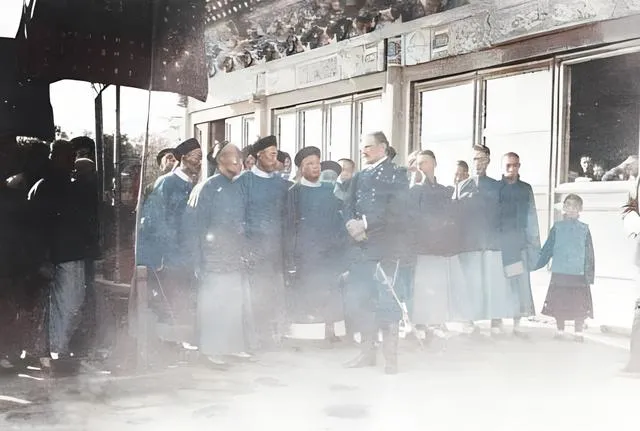 翻看这一组清末彩色老照片时心里一下就被拽回去了,颜色是新的,情绪却是旧的,礼仪与火器并排站在院里,一边是衣冠整肃的官民,一边是异域军服与旗帜,旧相机把当时的气味都锁住了,纸面一翻,仿佛还能听见人群里压低的嗓门和鼓点的回响。