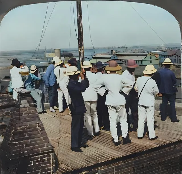 这张里头的人在屋顶望远,木质平台铺着板条,边沿钉了铁钉,帽子有草编的也有呢子的,大家把手搭在眉上,朝同一个方向看,有人脚尖离板,急得直往前探,场面像一只巨大的望远镜在缓慢转动,风从海口来,衣角被吹得鼓鼓的,谁也没说话,安静得只剩脚下木板的吱呀声。