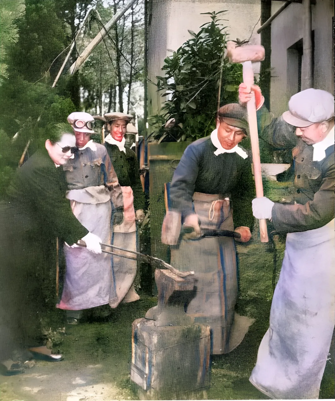 中 山 先生的夫人 庆 龄老照片:1958年参加炼钢。亲临炼钢炉前,亲自掌钳锻打。她在住宅的小花园里砌起一座炼低温钢的炼钢炉,亲临炉前,现场指导炼钢铁。她亲自掌钳,让年青人抡起铁锤在通红的钢块上锻打。炼出来的钢,质量很好,而且又省煤。