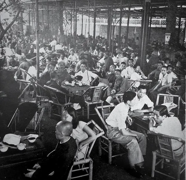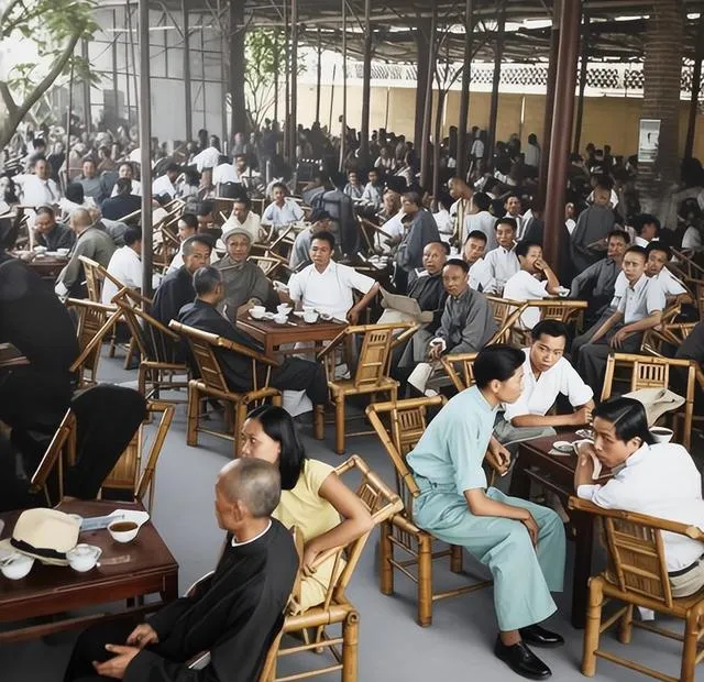这张热闹得很,图中这类场子叫露天茶馆,竹椅竹桌挤到没了缝,长嘴铜壶穿梭来回,开水往盖碗里一冲,茉莉香掀盖就跑,掌勺的穿着青布褂,脚底下打着拍子,侃事的、说书的、摆摊收账的,全往这里凑,爷爷说那会儿消息都是茶水里漾出来的,有时半碗茶能谈成一天活路,现在手机一响就知道天下事,味儿快了,闲气却淡了。