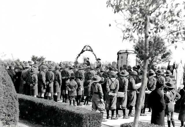 这个队列叫童子军致敬队,绿呢制服配宽檐帽,裤管收得齐,腿上黑长袜并成一片,队旗没入镜,肃立的背影已经把话说完了,先生们把帽檐压低,手里攥着花圈的缎带,风一吹,白布条抖两下就安静了,妈妈说那几年城里常有这种场面,孩子们学着大人的样子站直,声音小却硬气,说的是向烈士致礼。