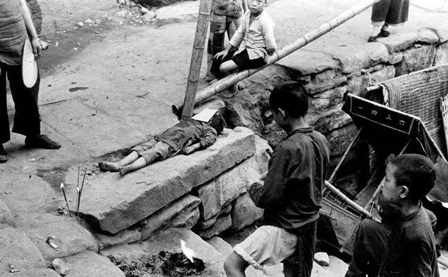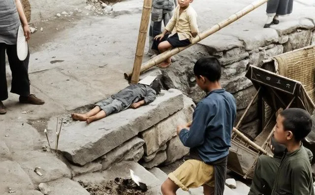 这处小小的场面叫路祭,石板上躺着个孩子,头上压一张白冥纸,旁边三炷香,火星在风口里闪,围着的娃都不说话,大人站远一点扇扇子,像怕把火吹大,又怕吹灭了,小时候听外公讲过,轰炸后的巷子里,谁都忙着找亲人,没条件的,就地安顿一下,烧几张纸,心里才踏实一点,唉,这一段不多说,照片已经把疼讲透了。