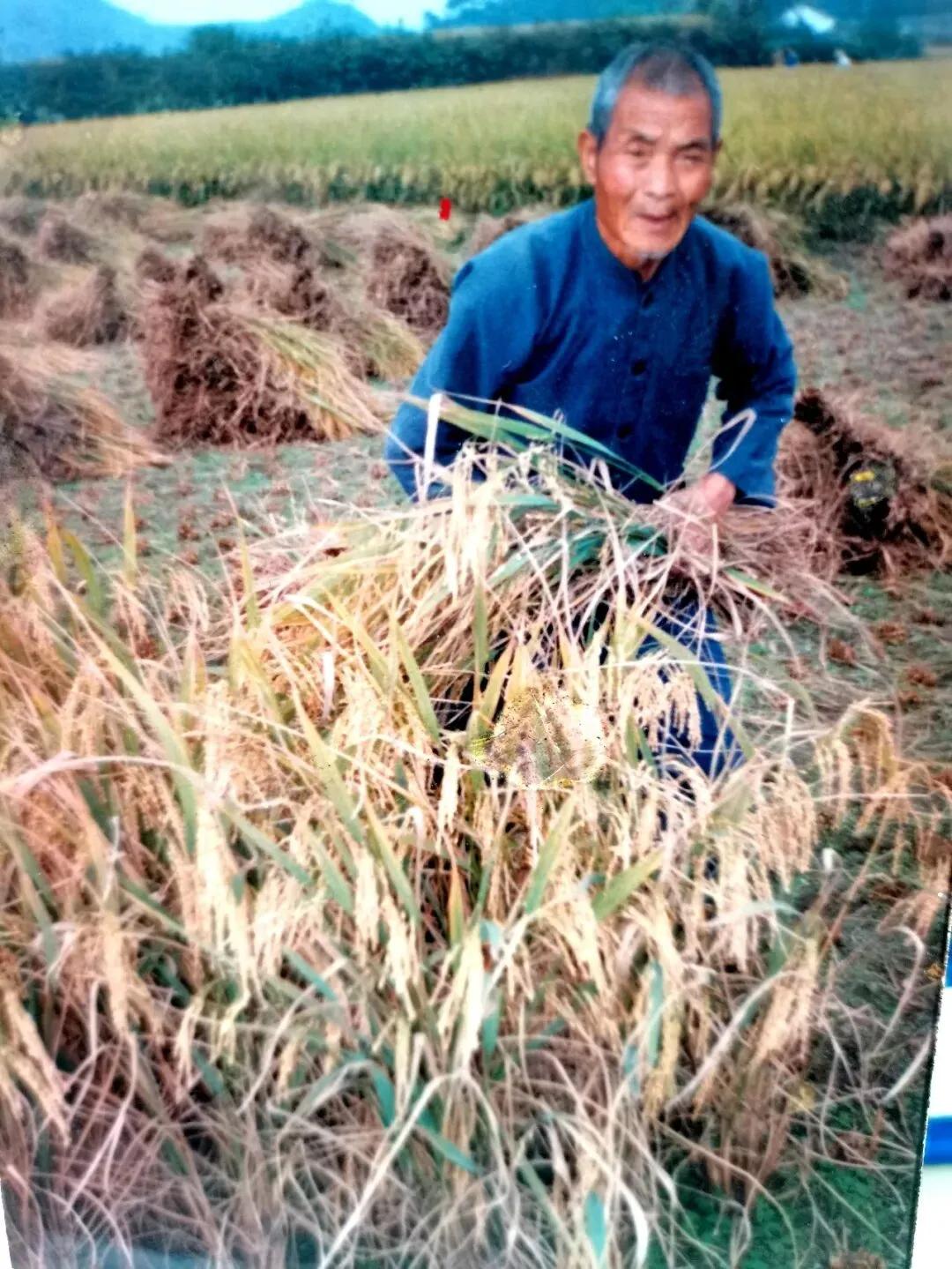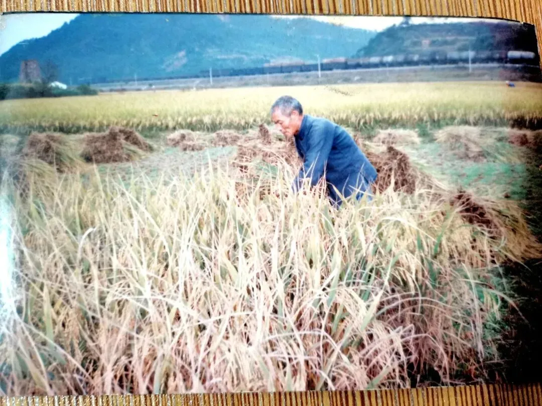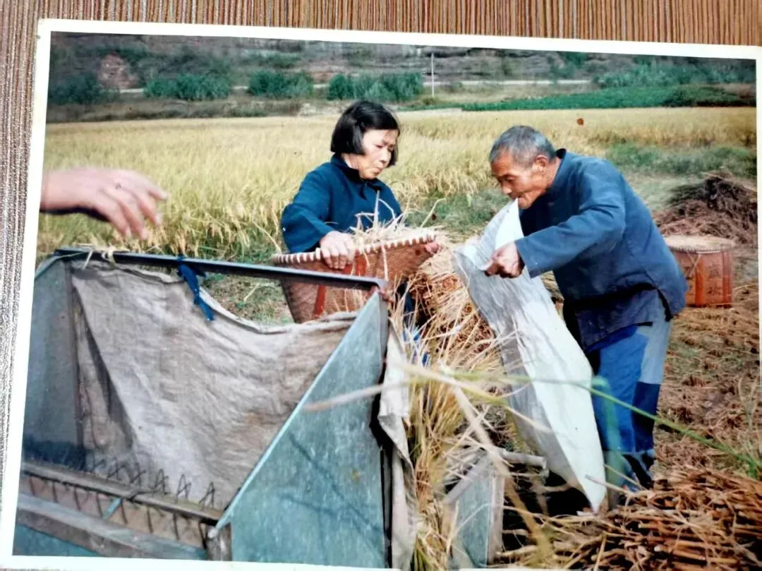 照片中的两位老人是胡友大的父母,他们身着朴素的蓝布衫,在金黄的稻田里忙碌。他们正用传统的人力打稻机进行脱粒,这是上世纪义乌农村常见的秋收场景。