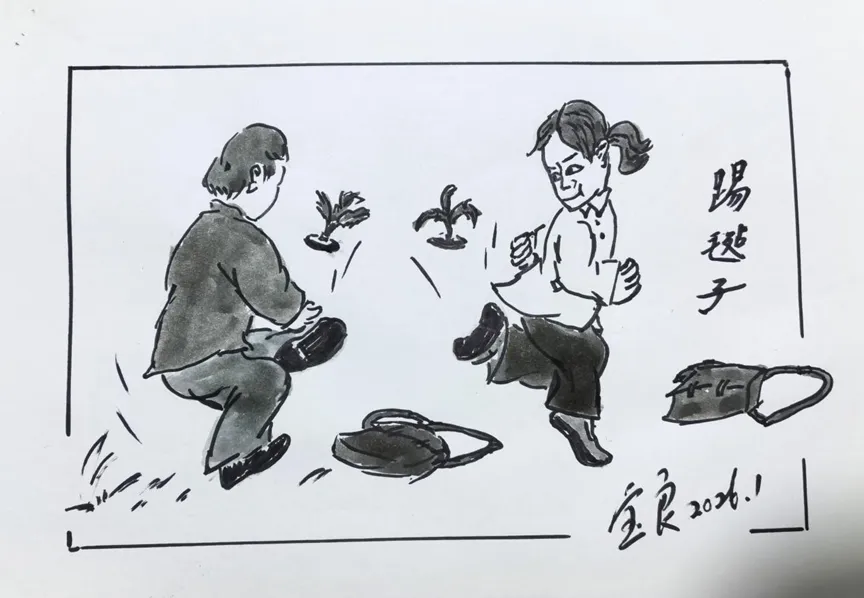 踢毽子:毽子一般是自己做的,用两块厚的圆布片包进一块圆铁片缝合,再用鸭毛管剪三叉竖起缝在圆布片上固定。找三根好看的鸡毛插上,就成了漂亮的毽子。踢毽子不落地就好,再看谁踢得多。更绝的是反身连续踢。