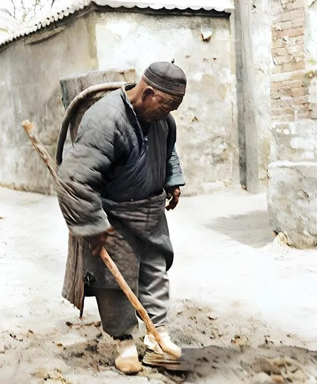 这个背着大筐的活儿就叫拾粪,手里那根长柄粪叉头部削扁,前端绑着铁片,老人的棉袄洗得发灰,袖口油亮,脚下草鞋磨出白边,他低着头在墙根细挑,遇见干的拣起,湿的割一块铺在筐边让风先吹一吹,爷爷说那时粪是宝,麦地要想旺,粪桶先要满,现在化肥一袋一袋往地里撒,快是快,拣粪这门细致劲儿也跟着没了。