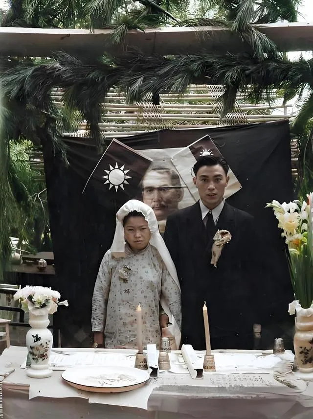 这张新郎新娘站在桌案后的合影,是简陋也郑重的婚礼,白瓷瓶里插着百合,烛台细长,烛泪顺着流下来,黑布背景上挂着画像和旗,衣料看着不厚,新娘的盖头折痕清清楚楚,妈妈说那个年代娶亲不讲排场,图个吉利和盼头,蜡烛点起来,生活也跟着亮一点。