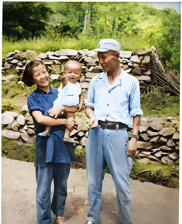 这张一家三口的合影,蓝布上衣被洗得泛白,袖口挽起来,男人腰间别着小刀,女人怀里抱着孩子笑得像开花,身后是石头垒的矮墙,缝隙里长了草,照片看着轻快,像饭后在村口歇一口气,妈妈说以前拍照稀罕,能留下几张就算福气,现在随手一拍成百上千,回头却不一定看第二眼。