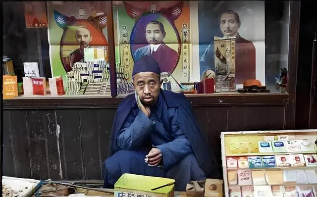 这个蹲在店门口的人是卖货的小贩,身后橱窗贴着彩印海报,台面上摆着花生和纸盒装的烟,红蓝相间的包装很精神,小贩下巴搁在手背上,像是在等第一位客人上门,奶奶打趣说这神情像在算账,也可能是在想今晚炖花生要放几撮盐,现在街头的摊位整齐多了,扫码嘀一下钱就到手,那会儿全靠吆喝,嘴皮子就是广播。