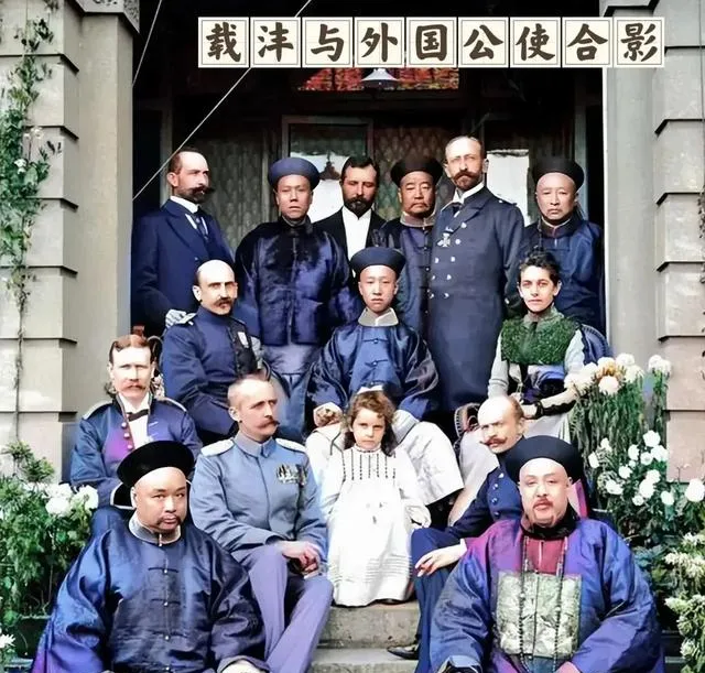 这张合影里坐满了穿长袍马褂与西装的人,胡子打理得一丝不乱,胸前勋章亮闪闪,门楣上挂着匾额,字写得苍劲,摆拍是讲究站位的,中间高个儿站着,前排人坐下把衣襟理顺,摄影师举手一压,所有人憋住气才按快门。