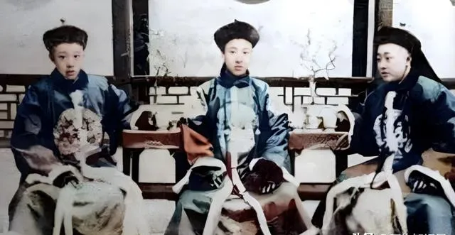 这三位小哥的袍子上缀着团花补子,绸料发亮,袖口里衬是白绢,桌上摆折扇与鼻烟壶,屋后的槅扇透着光,爷爷说补子不只好看,还分品级纹样,那时候规矩多,穿错了在街上都要被人指点。