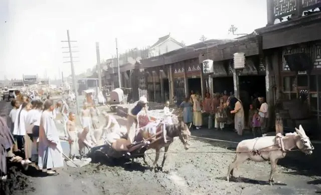 看这架马车栽进泥窝窝里,前面白马往前卧着使劲,后面几个人拽着车辕,围观的把衣袖搭在肩上唠叨两句,这就是老城的日常,晴天一身土,雨天一脚泥,现在下雨直接共享打车就走人了,当年可没这么舒坦。