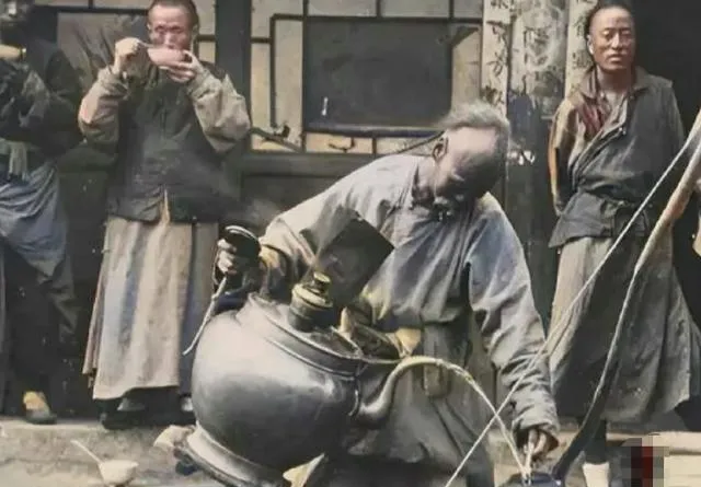 这玩意儿叫大碗茶,铁皮壶肚子圆滚滚,壶嘴长得像鸟喙,摊主一手提壶一手托碗,开水汩汩往外冲,喝的人端起就咕嘟咕嘟,一文钱解渴,夏天摊主先泡好放凉,桌上摆几碟芝麻盐,抿一口就续劲儿。