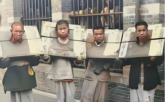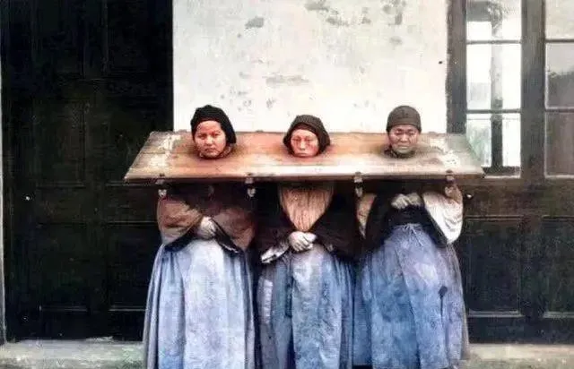 这块木颈夹上还贴着罪名纸条,四个人并排立在衙门口外墙边,眼神木木的,背后窗栏里探出人头看热闹,风一吹纸边翘起来,咯啦作响,到了今天,不体面不见光的刑罚已经成了历史里的照片,这一页翻过去就再别翻回来了。