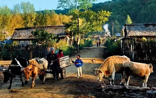 图中这条土道两边是篱笆和茅草屋,牛脖子上挂着木轭,木轮车吱呀吱呀地走,车辕上坐着人,身后还跟着个背着小布包的孩子,这套行头叫牛轿车,木轱辘厚重,压过的地面会留下深深的槽,早晨的炊烟刚起,奶奶说那会儿去集市得赶早,牛慢,人心不慌。