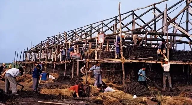 这片木杆子搭起来的是公社的临时大通铺,立柱、横梁、斜撑全是木的,再用稻草泥巴糊墙,顶上压草防风,男的抡杠,女的递草,孩子在地上踩泥巴玩,等夜里抽签留守,看田看仓,是那时候的老规矩。