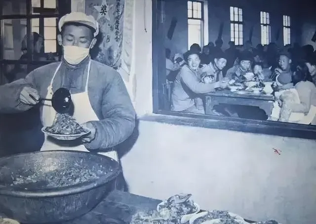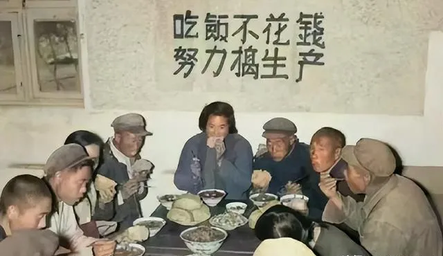 这张黑白照片里,长桌一溜儿排到了墙根,墙上还画着“英雄台”和“心愿台”,谁干了好活就写名字上去,孩子端着碗趴在凳上,小口小口扒饭,旁边人敲碗沿催他快点,像极了咱小时候的晚饭局。