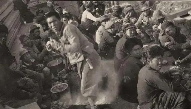 这一群人蹲在地上端着碗,是最原始的食堂,铁锅里勺子一舀分到手,热气在脸上化成汗珠,衣襟上全是土,谁也顾不上,吃完一抹嘴就开干,简单直接,不讲究排场,讲究顶饱。