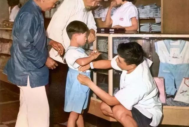 这张里小男孩站在柜台边,伙计拿软尺量腰身,玻璃柜里码着叠得齐齐的童装,外公笑着掏零花钱,说挑件耐穿的,缝线扎实不掉色,回家再让外婆收一收边,穿一年都不打蔫。