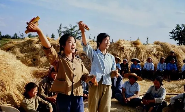 这两位手里的是快板,啪嗒啪嗒响亮,嘴里蹦出顺口溜,围成一圈的人笑出声,表演一停,掌声像潮水,文工团下地头,苦里也能刨出乐子,太阳挪到西边,影子拉得老长,谁也不着急走。