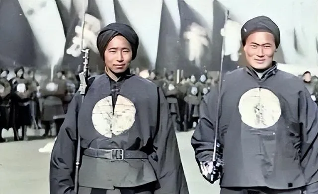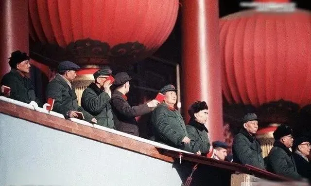 图中这排穿棉军大衣的身影叫检阅队列照,红灯笼压下来一片红,风一刮,衣领都竖起来了,照片里的人有的手捂耳朵有的举望远镜,神情各异,却都朝着同一个方向看去,这种大场面的笃定劲儿,现在隔着屏幕都能感到热浪扑面。