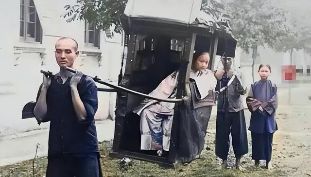 图里这顶小轿叫步辇,前后杠子抬着走,轿里人半掩着脸,旁边的小厮目不斜视,奶奶以前说,大门不出二门不迈的年代,女子出门讲的是体面,脚不落地,心里却不一定舒坦。