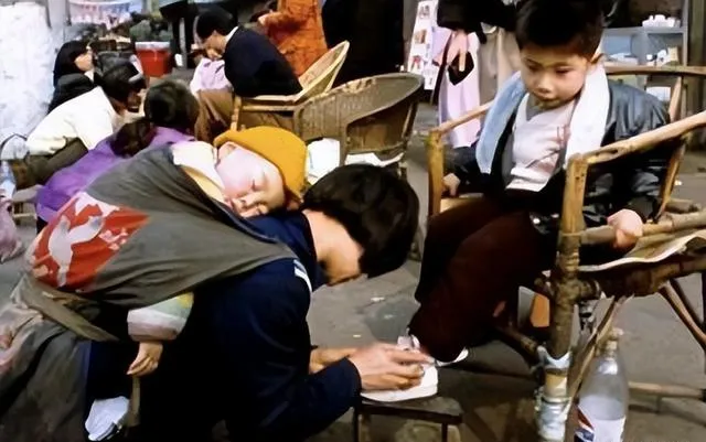 这个摊位叫擦鞋座,竹椅一字排开,客人是穿得光鲜的孩子,摊主背上也睡着孩子,手里还在抹鞋油,灯下黑的酸楚,全在那盏昏黄小灯里打转。