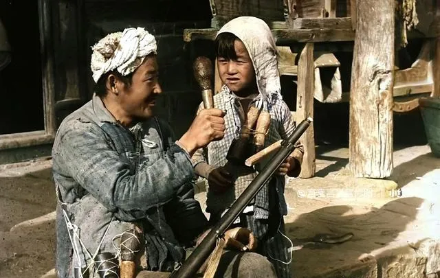 图中这杆子叫练习木枪,桌上摆着木头榴弹,父亲笑着比划,孩子皱着眉学,爷爷说那阵子有口粮就不错了,还得教会娃儿如何活下去,心一横也就懂了。