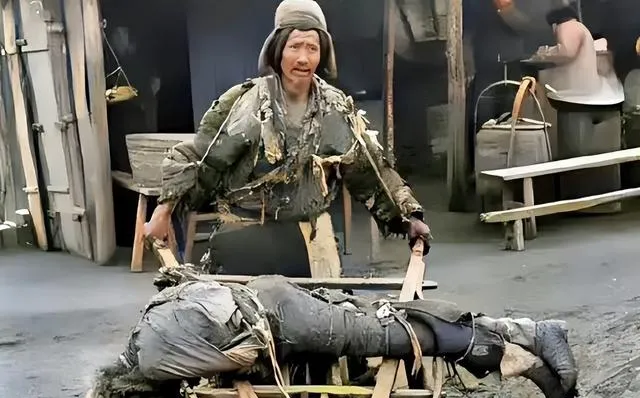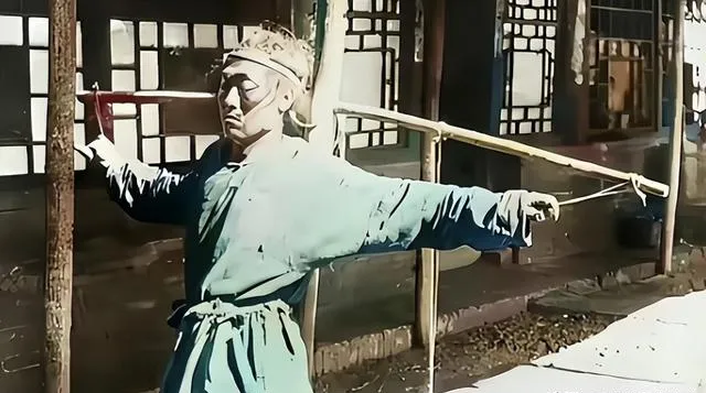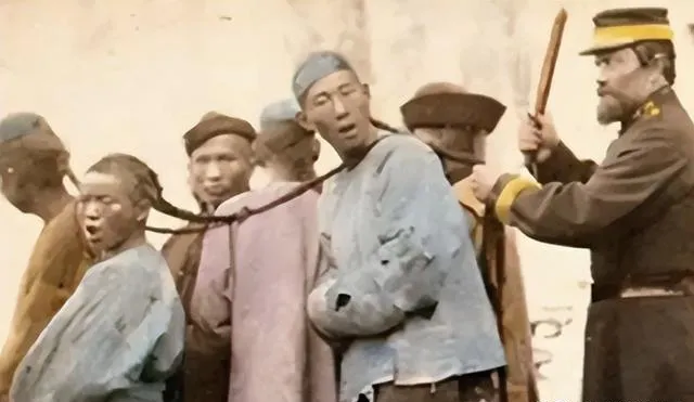 图中木杆横着,绳套勒住胳膊,这叫日晒枷,伤肉不见血,耗的是水分和意志,毒得很,老辈人一提就打寒颤。