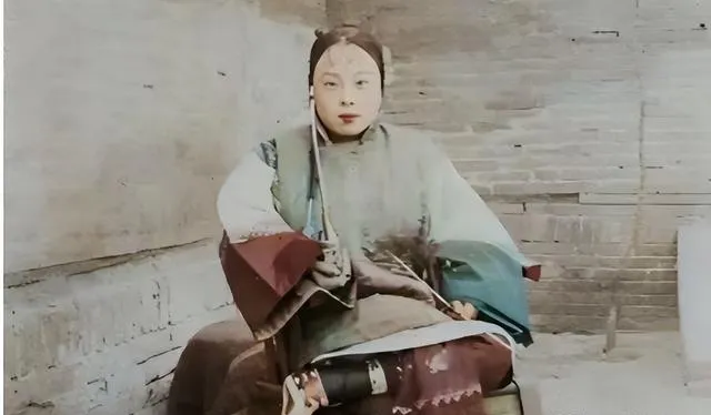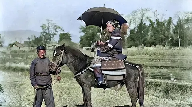 这姿势叫跨鞍,把洋伞一撑,脚尖刚到马肚子边,身后有人牵缰,姑娘家那会儿脚裹得小,走不远,只能坐骑或上轿。