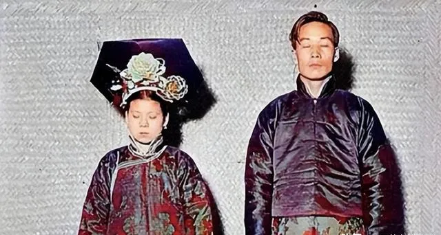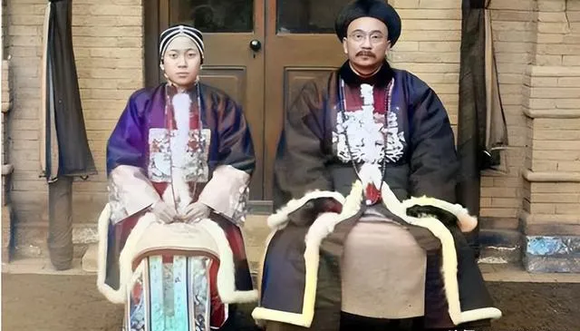 这对坐在门前,呢绒披衫绣得密,手里压着团扇,像在说,拍吧,我们的好日子得留个影,色调老却不旧。