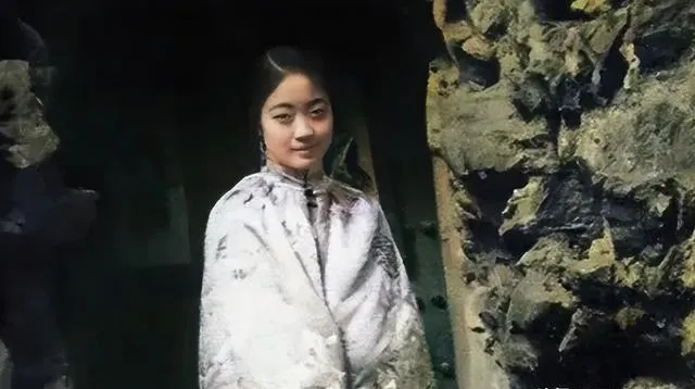 这姑娘披着浅色披肩,眉眼温婉,衣服素净,站在石缝旁,风一吹,像要笑也像要叹。