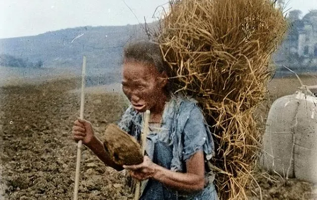 这位瘦得皮包骨,肩上驮着成捆的稻草,手臂青筋鼓着,嘴里不知嘟囔啥,苦日子的重量,一把柴就够。